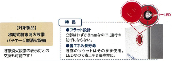 フラットになって、いい感じ!『フラット表示灯』(特許出願中) でっぱりのないフラット設計の表示灯が新登場。 スッキリとしたデザインで視認性が向上し、通行の妨げにもなりません。 既存の移動式消火設備/パッケージ消火設備の表示灯との交換も可能です。 ヤマトプロテック株式会社 Quick News No.350より抜粋 « 前のページに戻る