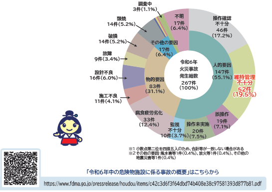 消防庁が、「令和6年中の危険物施設に係る事故の概要」を公表しました。これによると、危険物施設の数は減少している一方で、火災の発生件数は年々増加傾向にあります。また、火災事故の発生原因は維持管理不十分が19.5%と最も多く、人的要因が55%を超えています。