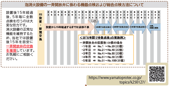 2021年5月に泡消火設備の一斉開放弁の点検頻度が改正され、設置後15年経過後は、5年で全数点検が必要となりました。